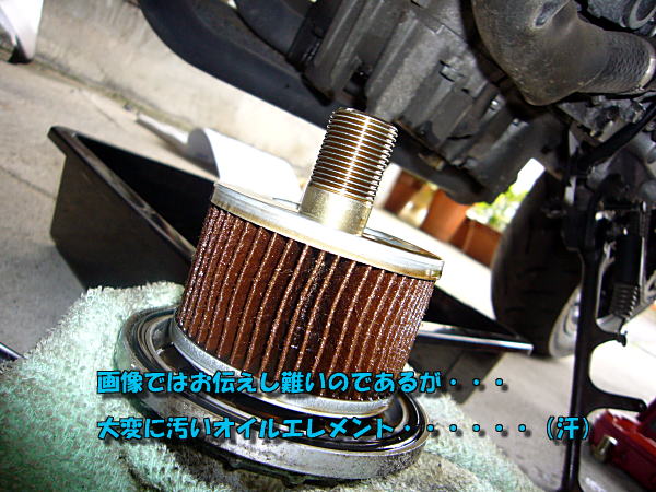 オイルドレンボルトもエレメント取付ボルトも過大トルクで締め付けてあり、緩めるのに難儀した104氏である。