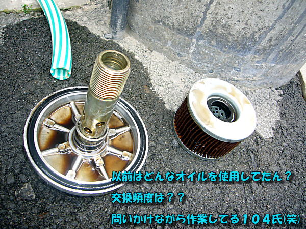 少し苛々しながらもせっせとオイルエレメントの蓋とストレーナを掃除する104氏。