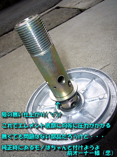 オイルエレメント底部へかかるスプリングのテンションを面で均一に受け止める内径20mm(推定)のワッシャプレートがいない!