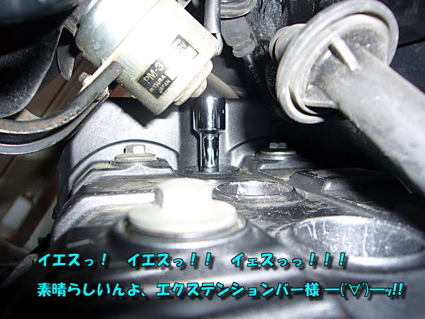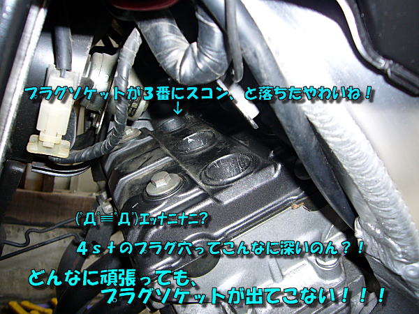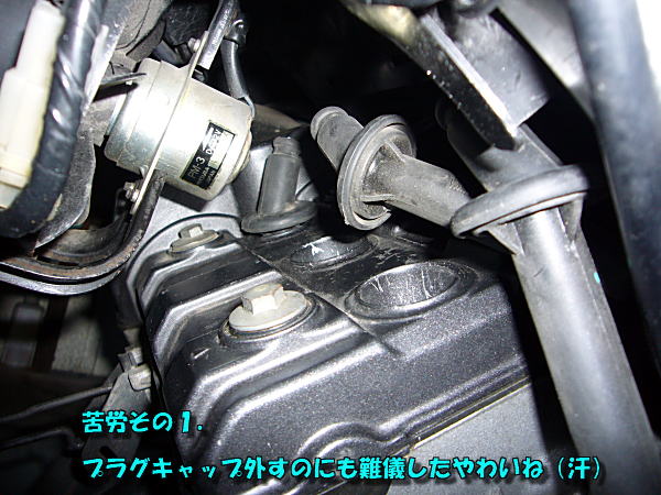 新品イリジウムプラグをプラグホールに締め込んだ後、プラグキャップの取り付けに104氏がまた泣きそうになっていたのは内緒である(笑)