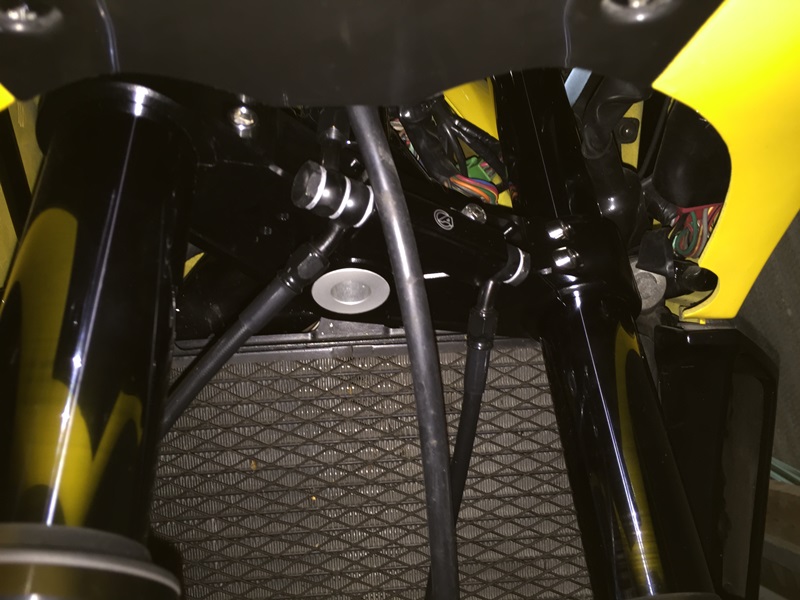 オーリンズの黒い前脚には、トップブリッジ上側へのセパハンクランプを視野に入れて、延長キットが組んである。