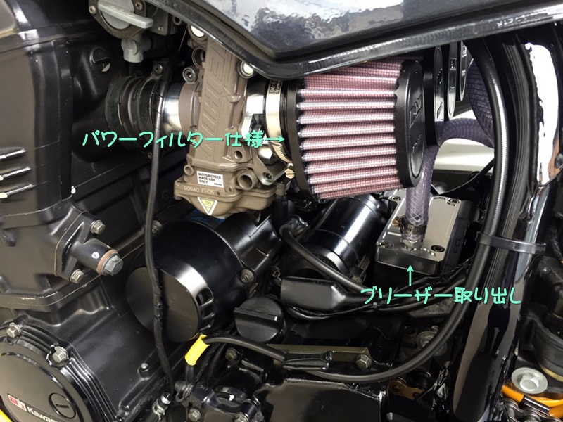 純正エアクリーナーBOXを撤去することになったので、オイルキャッチタンクを装着しブリーザー取り出し口も設え直したのである。