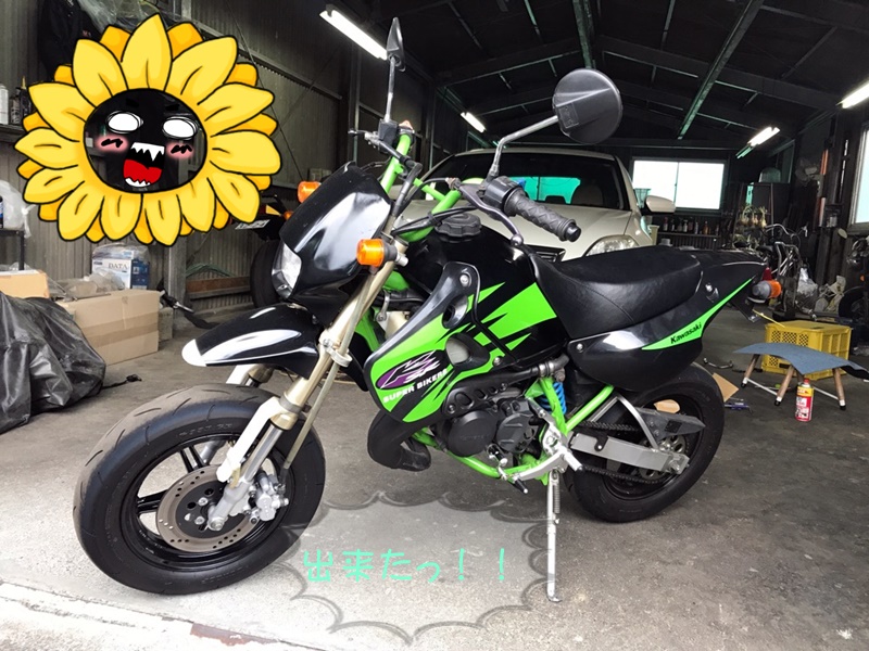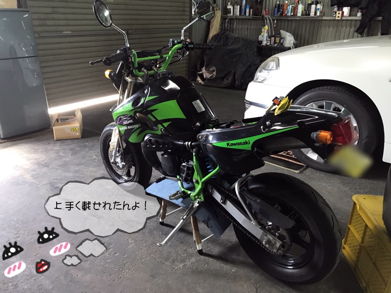 面倒臭がりの104氏は小さな台をガレージで発見し、そいつにチョコンとKSRを載せた。