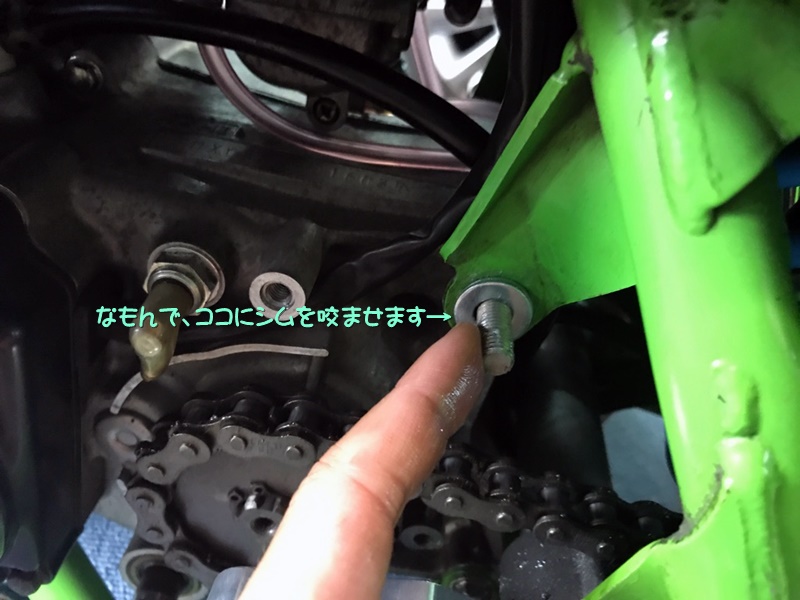 先刻御承知のズレなので予め仕入れておいた2mmほどのシムをエンジンマウント部に追加する104氏。