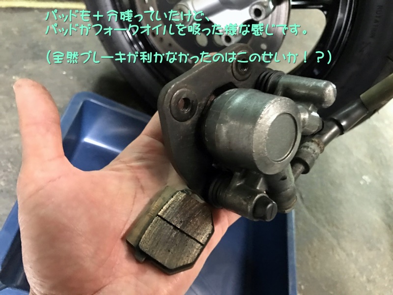 施工前のフロントフォークはオイルダダ漏れだったので、そのオイルをブレーキパッドが思いっきり吸ってしまっていたのだと思われる。