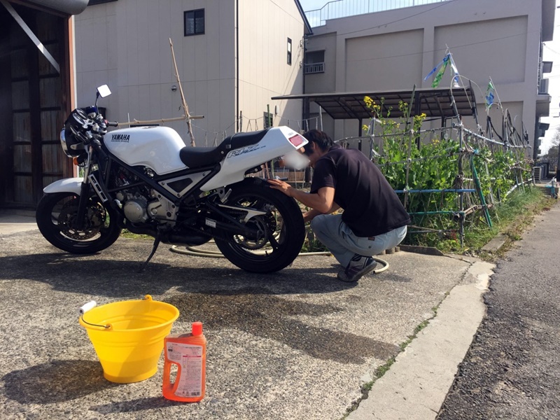 一生懸命R1-Zを洗う家自慢氏、お互いアラフォーの憂いを呟き乍らマシンの整備を図ります。