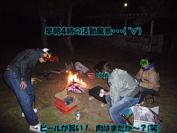 焚火から離れれば「寒みーよ!」、焚火に近づけば「炎が熱ちーよ!」などと言いながらもビールが旨い!!